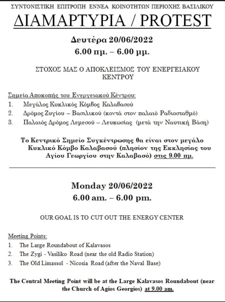 Following the recent tyre fire the organisation of the nine communities of the Vasiliko area have decided on further action to protest against the continued industrialisatin of the area. The following is a notice of the protest to take place on Monday 20th June.