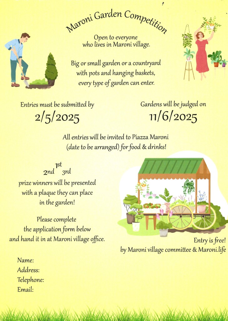 Spring is here and the Maroni Garden Competition entry date is getting close. Do remember to submit your entry to the village office by the end of the day on Friday 2nd May. If you did not receive a leaflet with the application form, you can write your name, address telephone number & email on a piece of paper, head it ‘Garden Competition’ and hand it in to the office.